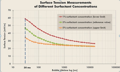 因此使用鼓泡法动态表面张力仪,可以测出不同表面活性剂浓度时的表面张力变化,从而指导来料检验、研发、生产质检等。