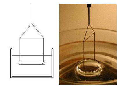静态表面张力如拉环法,是利用一个初始浸在液体的环从液体中拉出一个液体膜,测量环脱离液面时需要施加的力来计算出表面张力。