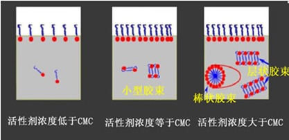 1、液体中的表面活性剂浓度在临界胶束浓度(CMC)以下,这时,静态表面张力随时表面活性剂浓度的增大而减少,如下图的斜线部份。